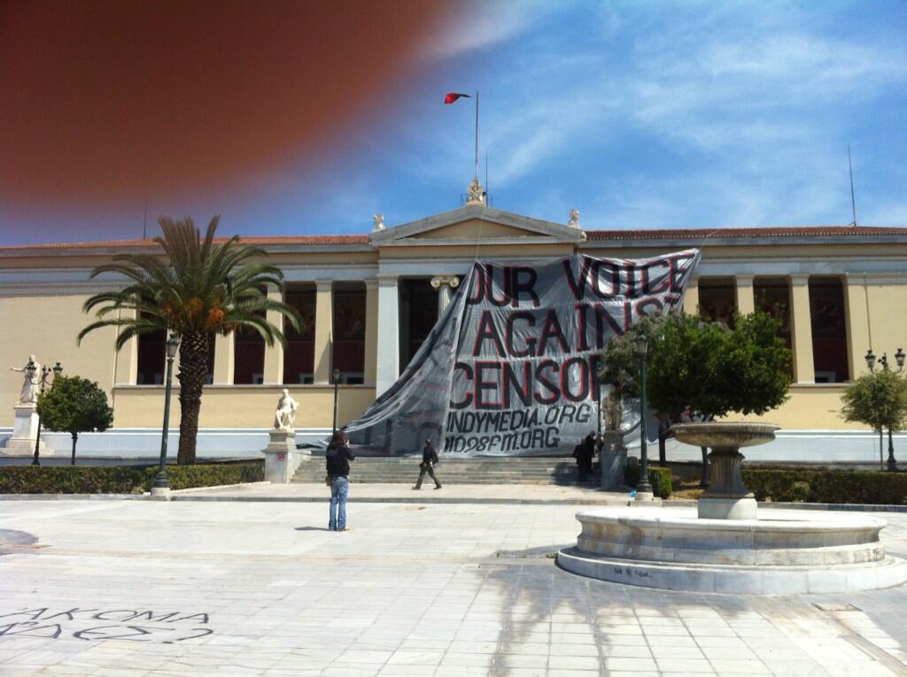 Πανό ενάντια στην κρατική λογοκρισία και σε ένδειξη αλληλεγγύης στο Indymedia και στο Radio98fm σήκωσε ομάδα περίπου 30 ατόμων νωρίτερα στο κτίριο της Πρυτανείας.